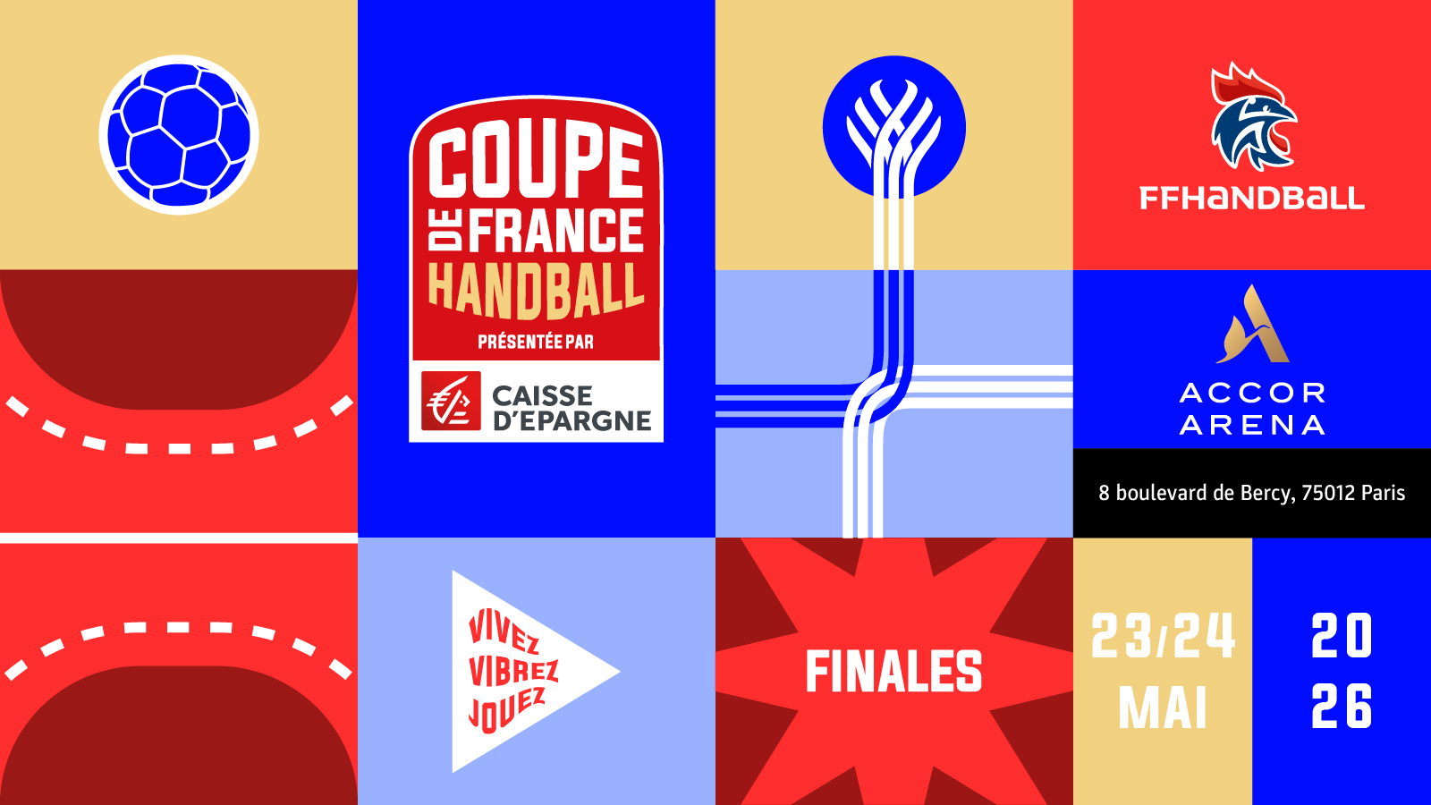 Les Finales 2026 de la Coupe de France de handball présentée par Caisse d'Épargne reviennent pour un week-end inédit ! Pour cette nouvelle édition, les supporters de handball pourront vivre un week-end 100% handball à l'Accor Arena, à Paris, les 23 et 24 mai prochains.